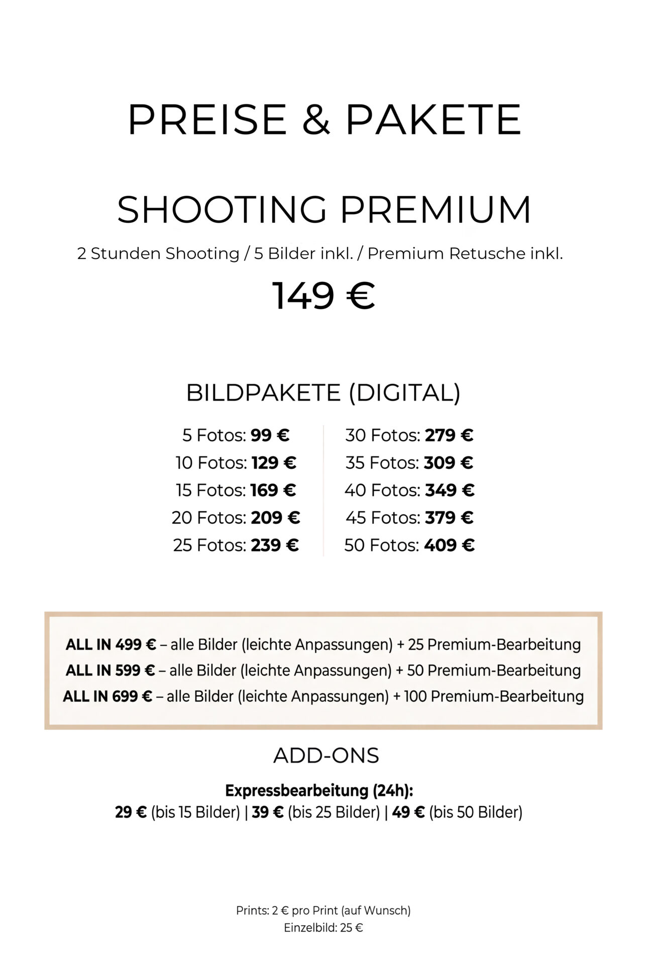 Das Outdoor-Fotoshooting ist in jeder Shooting-Kategorie wählbar. 100 % Spaß und viele spannende Extras, mit denen du deinem Fotoshooting eine spezielle Note verleihst! Dein Fotoshooting wird garantiert zu einem unvergesslichen Erlebnis mit deinen Liebsten an deinem Lieblingsort! 120 Min. Fotoshooting. Die Anfahrtszeit wird als Teil des Shootings berechnet. Jede weitere Stunde kostet 49 €. Ab einem Umkreis von 20 km fällt eine Anfahrtspauschale von 2 € pro km an.